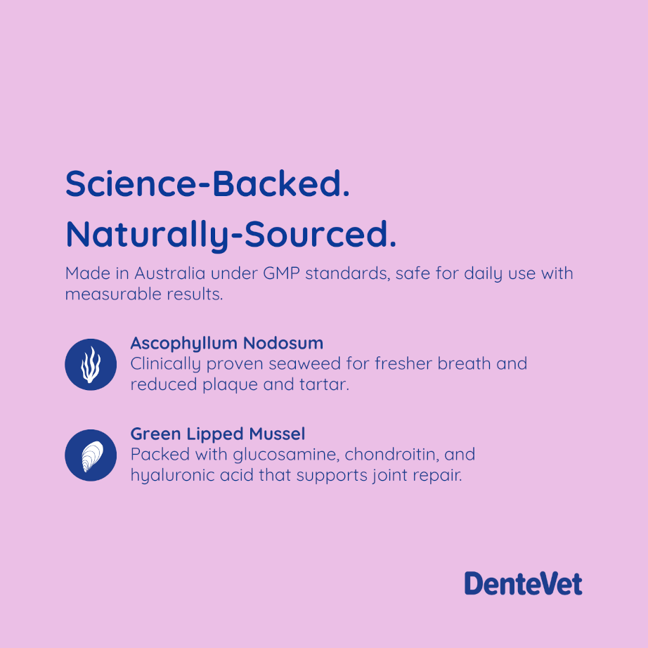 A natural supplement to help reduce bad breath, plaque and tartar & support joint health in dogs and cats.